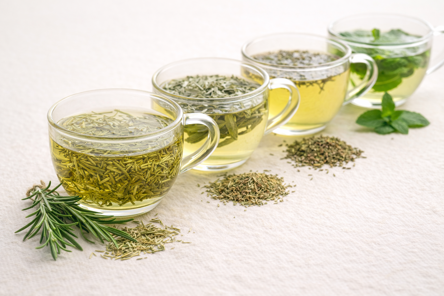 Während Pfefferminztee kühlend und frisch wirkt und Thymiantee eine leicht scharfe Note besitzt, bleibt Rosmarintee würzig, trocken und mediterran. Sein Aroma erinnert stärker an die Küche als an klassische Teekräuter, was ihn besonders eigenständig macht.